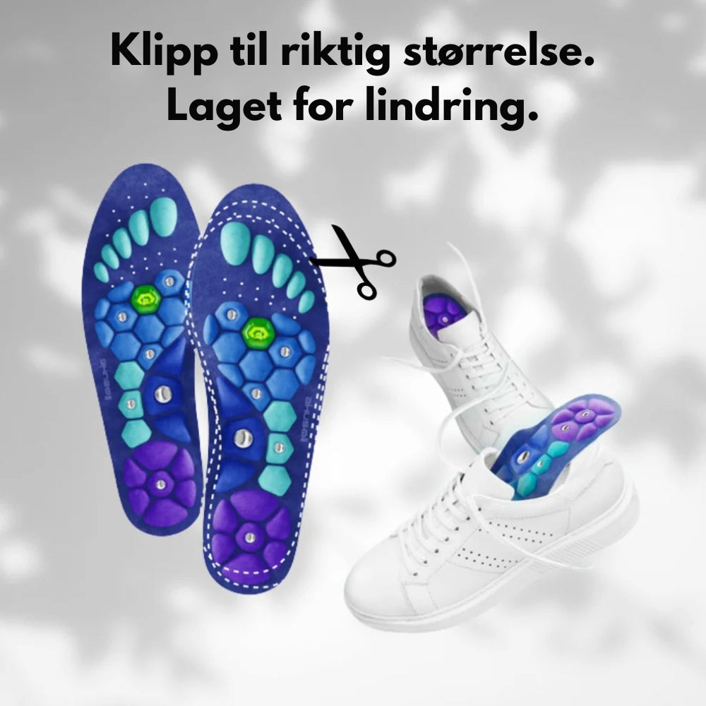 Ortopediske Akupressursåler kan enkelt klippes til med saks, slik at de passer perfekt til din skostørrelse. Enten du bruker joggesko, arbeidsstøvler, dressko eller tursko – de glir rett inn.