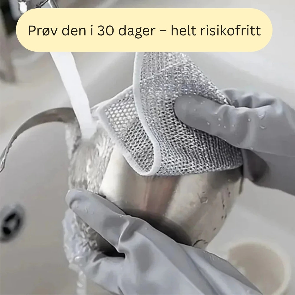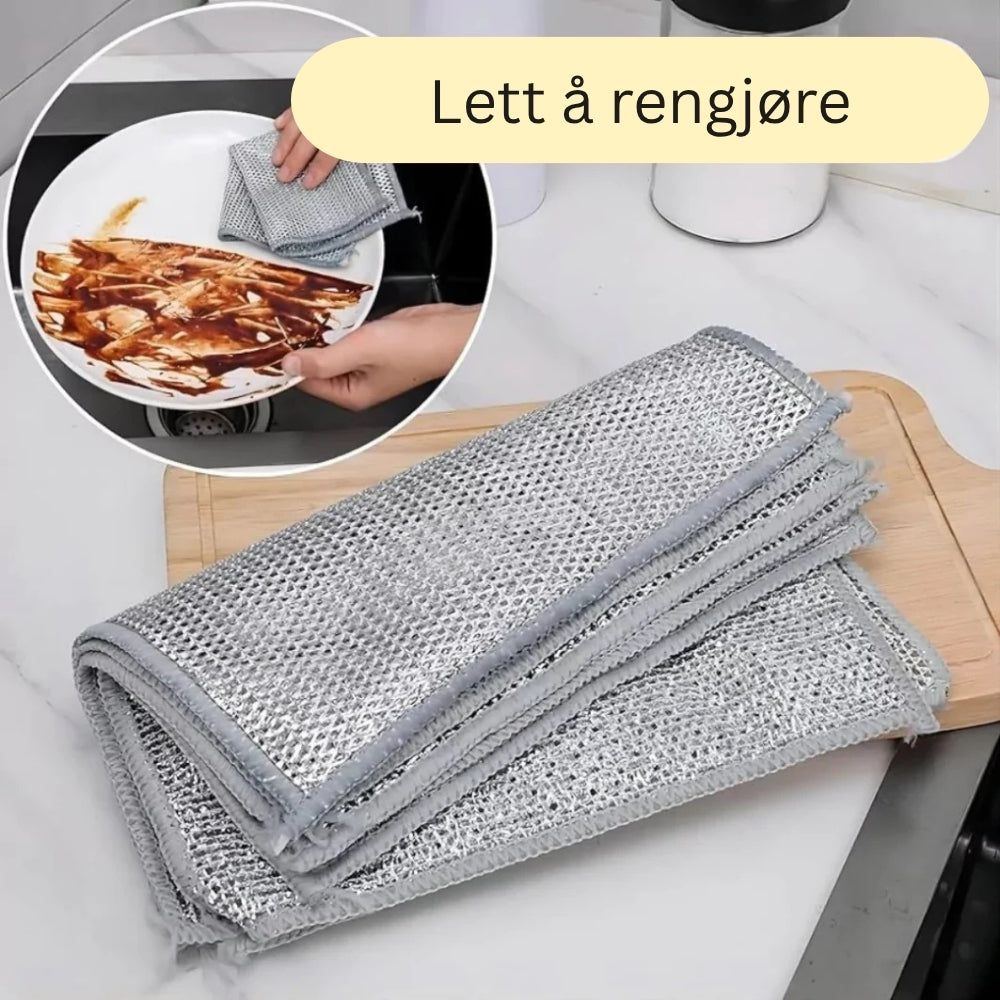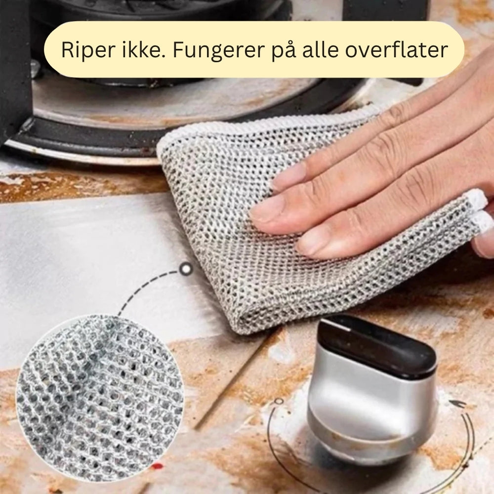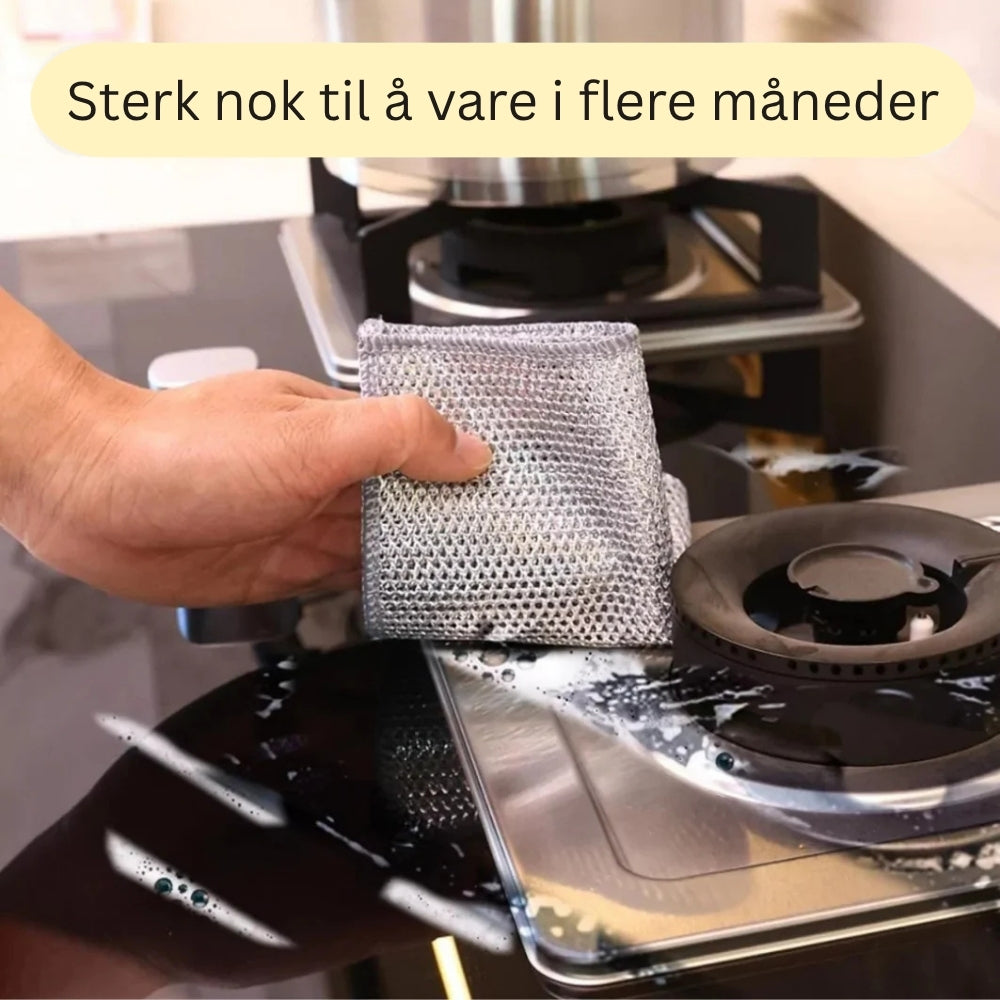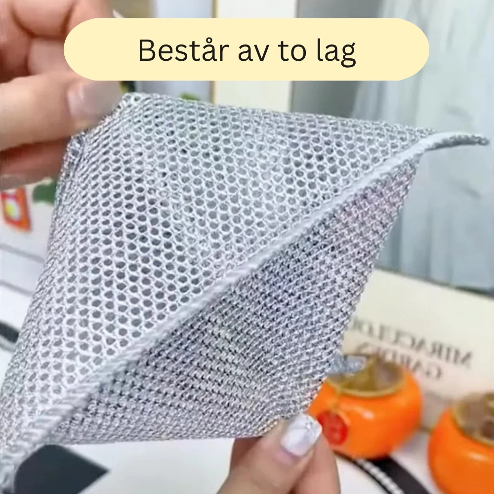 StålKlut er laget med 3 lag vevd stålfiber, noe som gjør den ekstra sterk og holdbar. Det doble laget gir bedre skrubbeeffekt og sørger for at kluten varer mye lenger enn vanlige svamper.