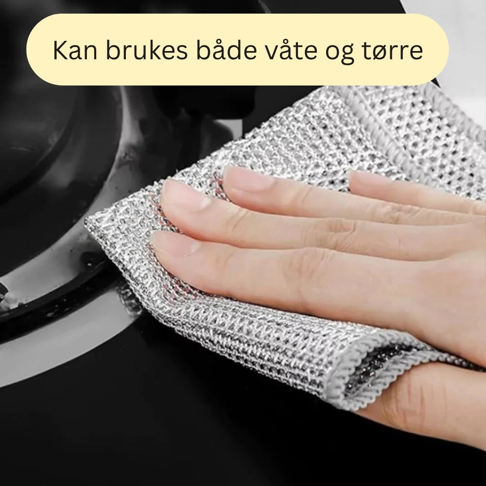 StålKlut er vevd med ultra-robuste rustfrie ståltråder – den rengjør bedre, varer lenger og holder seg frisk vask etter vask.