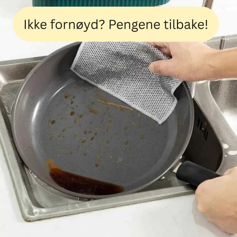 StålKlut skrubber selv de mest inngrodde grytene uten å ripe. Den kan vaskes i maskin, tåler lukt og går aldri i oppløsning.